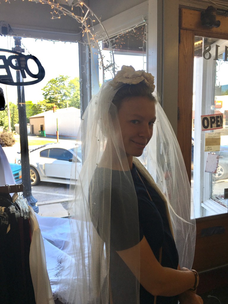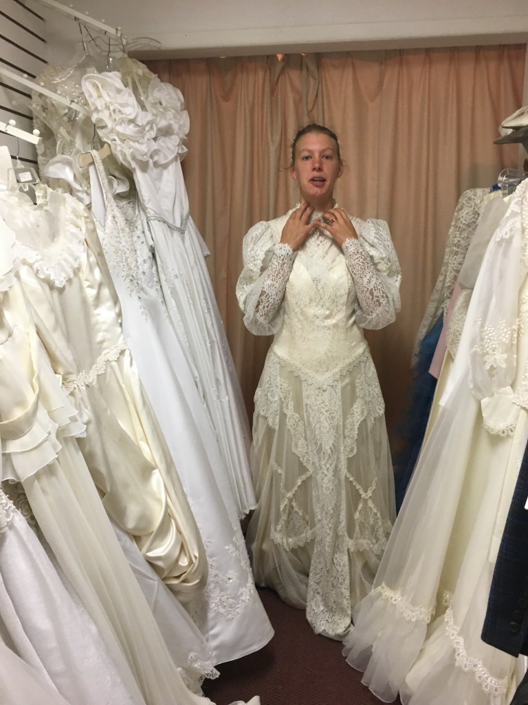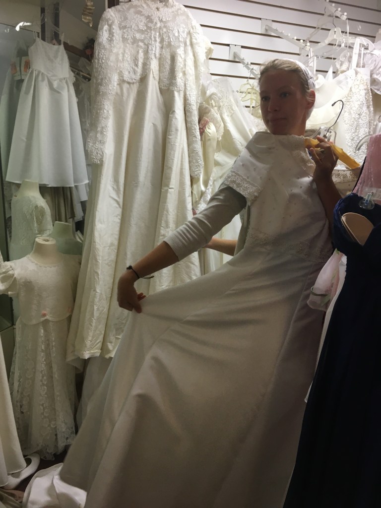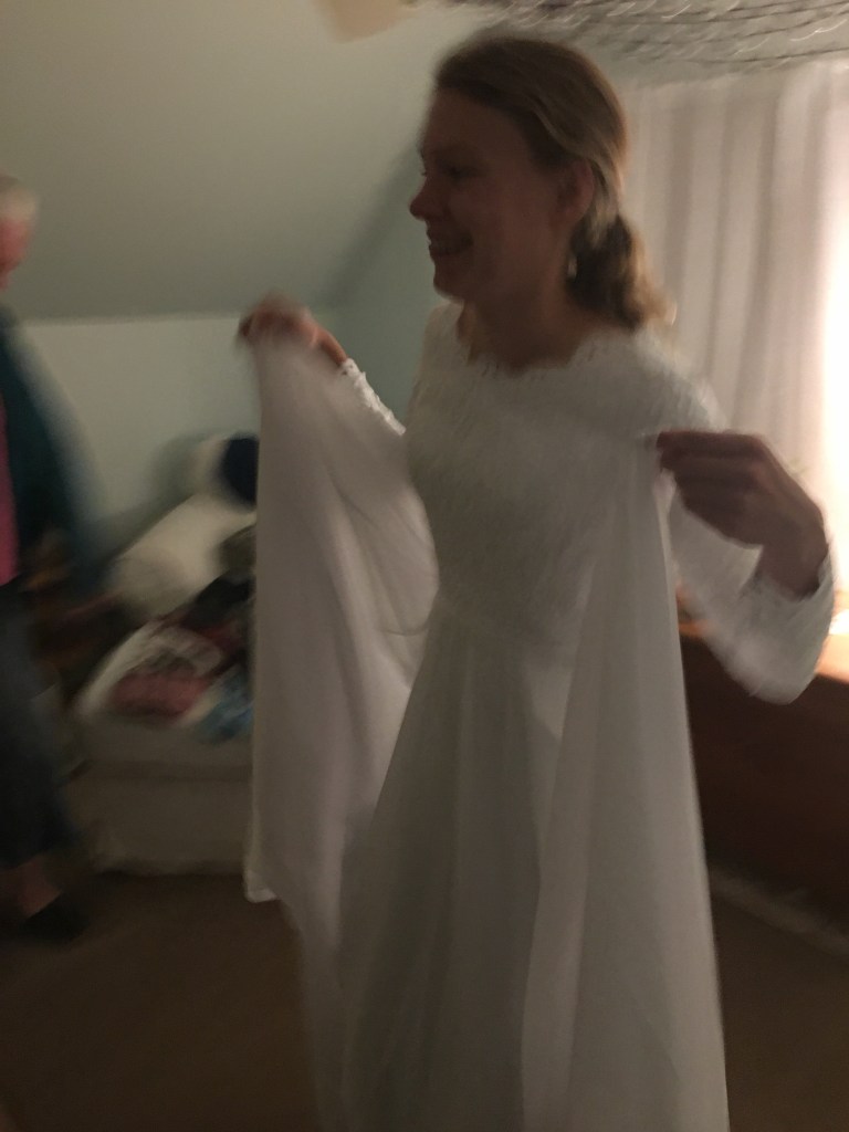 In the meantime, Anna’s wedding-dress arrived. Upon trying it on, the first thing she did was flap her voluminous skirt like wings and go, “Hey look, Sarah, I’m a bat!!”