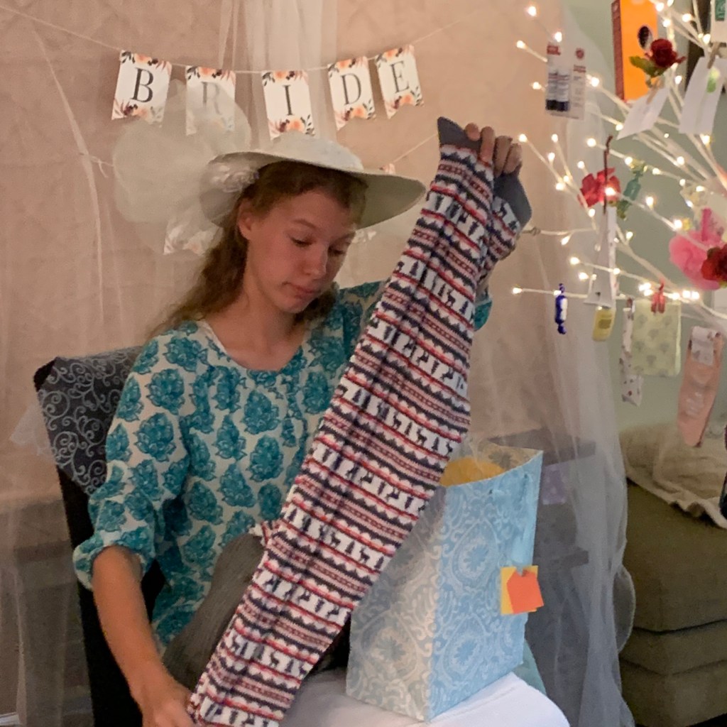 Something I’d never completely realized about bridal showers is that the maid-of-honor is expected to sit primly beside the bride and keep a record of the gifts and their givers. Which was fine, except that Anna does everything at the speed of light, and no sooner had I managed to write “dish clo” down than she’d already moved on from the dish cloths and was opening something else.